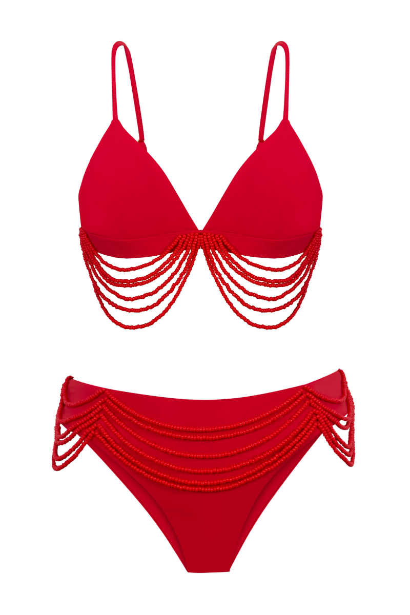 Nuestro top Cherry es un top de triángulo fijo con cargaderas ajustables. Está hecho con una tela suave y elástica, e incluye un bordado manual con chaquirones que caen como una cascada. Es una pieza delicada con un toque lujoso. Tiene copas removibles. Composición de la tela: 79% POLIAMIDA 21% ELASTANO. Prenda delicada. Evitar recostarse en superficies ásperas.