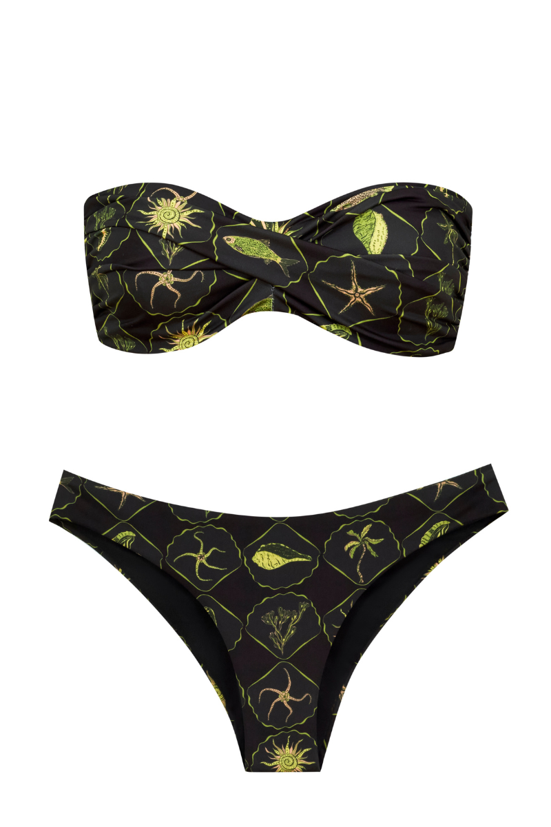 Nuestro top Sophie es un top bandeau con drapeado frontal, varillas laterales, varillas interiores y amarre en la espalda. Tiene cargaderas removibles. La tela es suave, elástica y tiene estampado. Composición de la tela: 81% Poliester 19% Lycra.