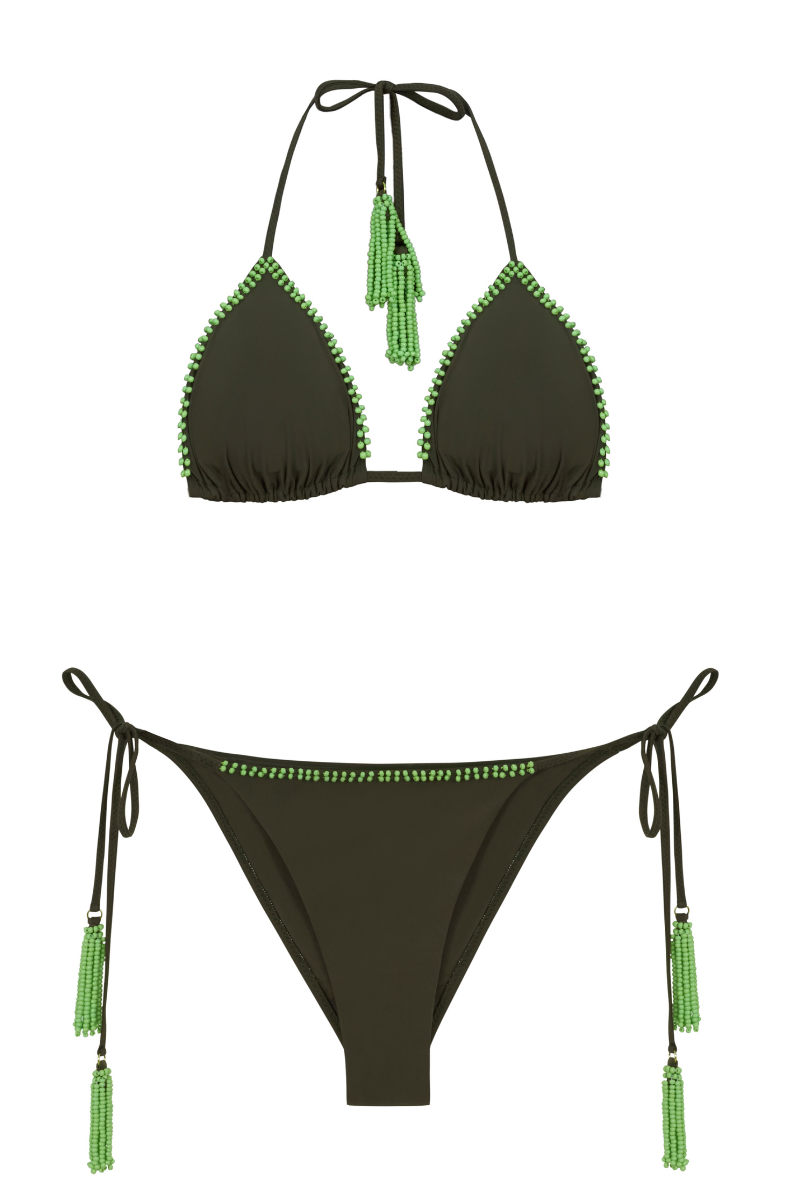 Bottom básico de amarrar con corte moderado hecho en tela suave y elástica. Está bordado con chaquirones y tiene unos pompones tejidos con chaquirones en las tiras de ajuste. Composición de la tela: 79% Poliamida 21% Elastano. Prenda delicada. Evitar recostarse en superficies ásperas.