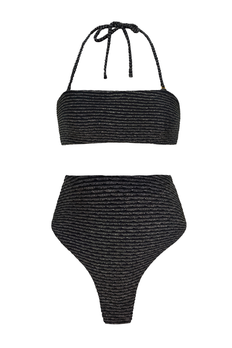 Bottom alto a cintura hecho en tela suave con lurex plata. Composición de la tela: 87% Poliamida 7% Elastano 6% Fibra metalica.