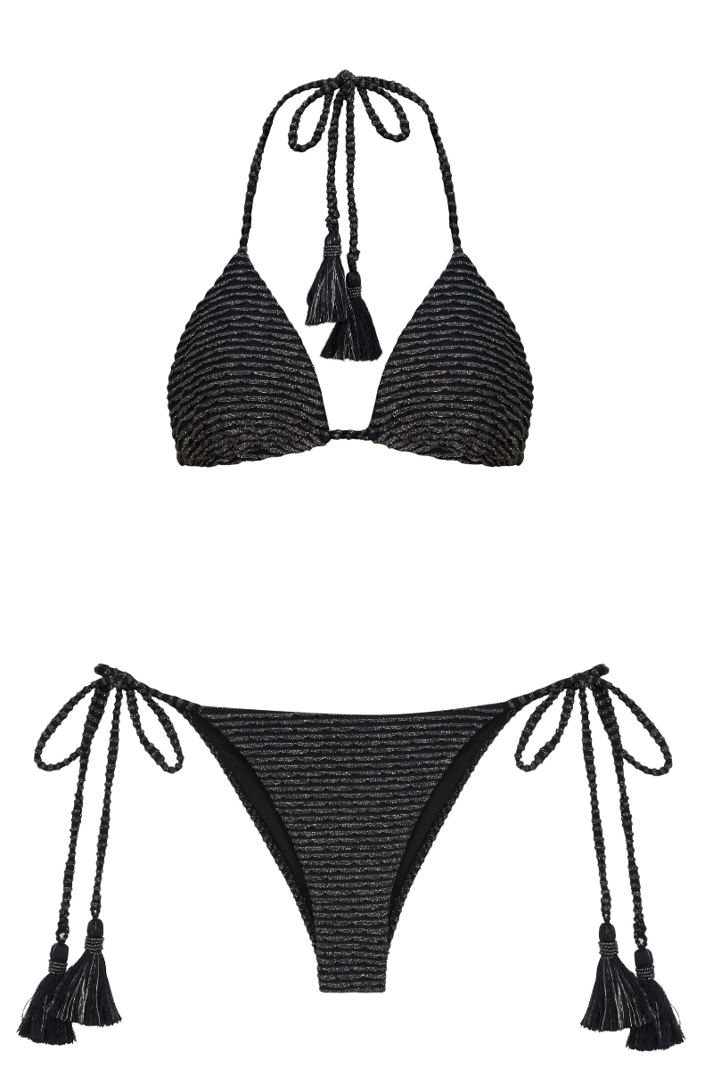 Nuestro Wade bottom es un básico de amarrar con corte moderado hecho en tela suave con lurex plata. Tiene unos pompones tejidos en las tiras de ajuste. Composición de la tela: 87% Poliamida 7% Elastano 6% Fibra metalica.